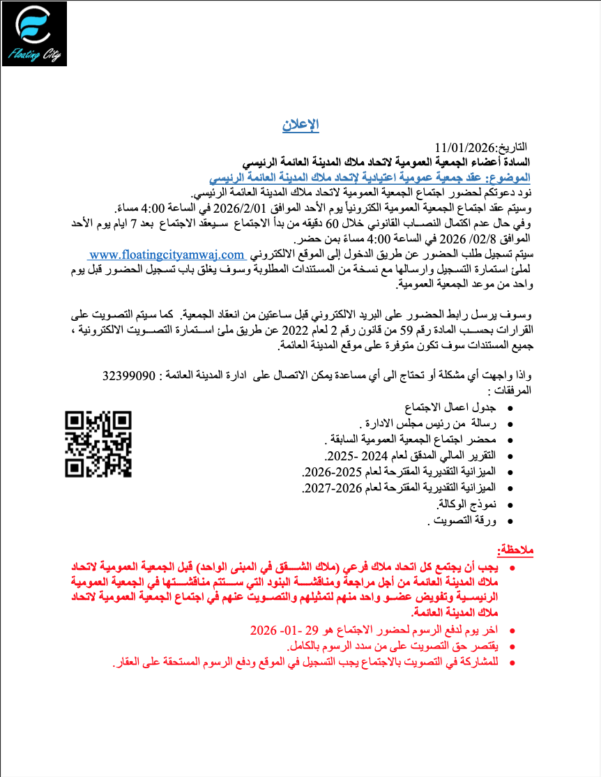 نود إحاطتكم علماً بأنه سيتم قريباً تحديد موعد انعقاد الجمعية العمومية الاعتيادية لجمعية اتحاد ملاك المدينة العائمة ، وحيث إن فترة عضوية أعضاء مجلس الإدارة الحالي قد انتهت فقد تم فتح باب الترشح لعضوية مجلس إدارة جمعية اتحاد الملاك الجديد.
